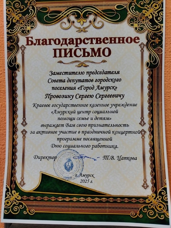 🌟 Руководство центра вручило Сергею Провозину благодарственное письмо за внимание к работе учреждения.