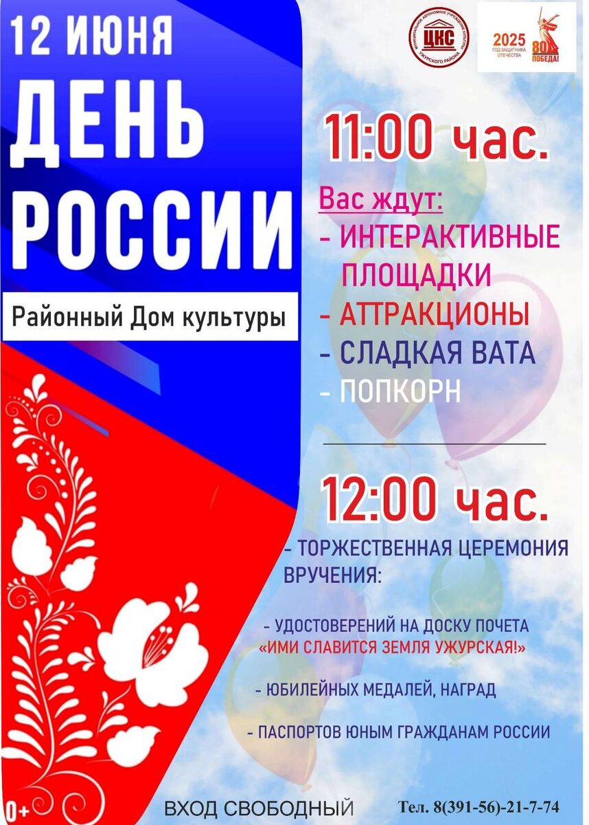 🖌️12 ИЮНЯ ДЕНЬ РОССИИ🇷🇺 Районный Дом культуры подготовил программу, посвященную Дню России. Начало в 11:00 часов. Вас ждут: - ИНТЕРАКТИВНЫЕ ПЛОЩАДКИ - АТТРАКЦИОНЫ - СЛАДКАЯ ВАТА - ПОПКОРН 12:00 час. - ТОРЖЕСТВЕННАЯ ЦЕРЕМОНИЯ ВРУЧЕНИЯ: - УДОСТОВЕРЕНИЙ НА ДОСКУ ПОЧЕТА «ИМИ СЛАВИТСЯ ЗЕМЛЯ УЖУРСКАЯ!» - ЮБИЛЕЙНЫХ МЕДАЛЕЙ, НАГРАД - ПАСПОРТОВ ЮНЫМ ГРАЖДАНАМ РОССИИ 0+ ВХОД СВОБОДНЫЙ
