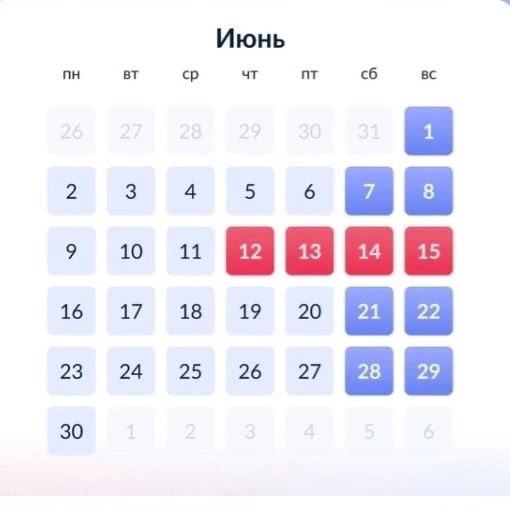 При пятидневном графике нас ждут целых 4 выходных дня подряд: 12 июня (четверг) — День России, 13 июня (пятница) — выходной, перенесённый с субботы 8 марта, а 14 и 15 июня — суббота и воскресенье.