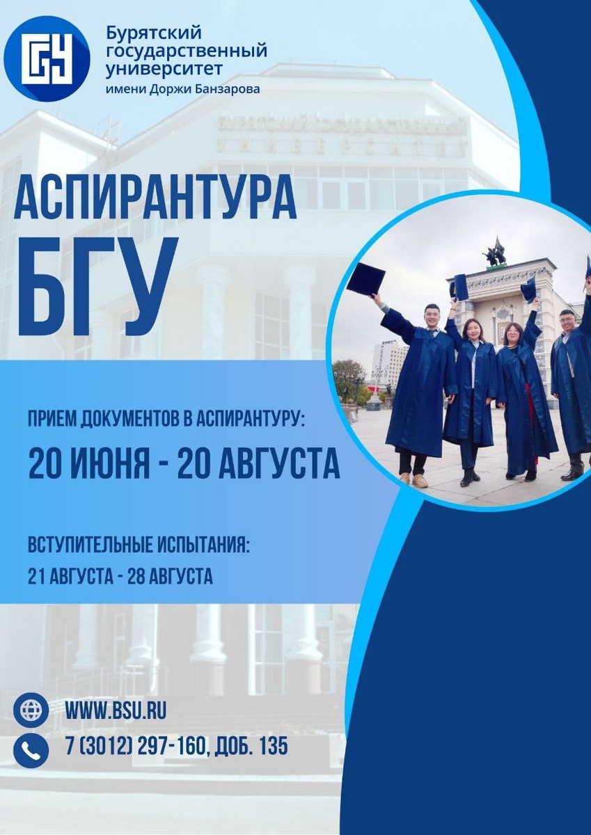 📢 Вниманию поступающих в аспирантуру! Бурятский государственный университет им. Доржи Банзарова объявляет начало приёма документов в аспирантуру 20 июня - 20 августа 2025 года. 🗓 Вступительные испытания стартуют с 25 августа 2025 года. Если вы стремитесь к научному росту, хотите углубить знания и внести вклад в науку — не упустите шанс! 🎓 Выбирай БГУ — поступай в аспирантуру, создавай своё будущее уже сегодня! 📍 Подробности о направлениях подготовки, перечне документов и порядке поступления смотрите в разделе «Аспирантура» на сайте. Сайт: @bsu.ru Звони: 7(3012) 297-160, доб. 135 Пиши: opkvk@bsu.ru