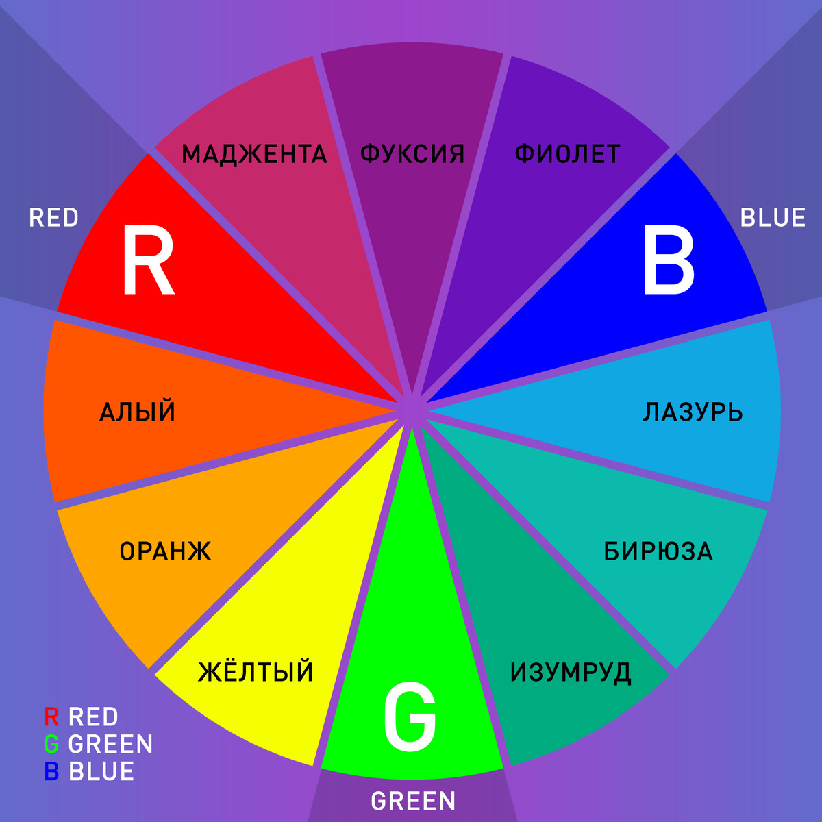RGB - цветовая модель. Red (красный), Green (зелёный), Blue (синий). Промежуточные цвета: алый, оранж, жёлтый, изумруд, бирюза, лазурь, фиолет, фуксия, маджента.
