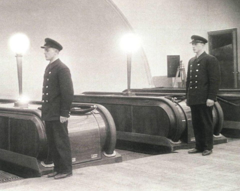 1935 год. Давненько было, аж 90 лет назад. Время уже кажется непонятным - это даже по фото видно. Не совсем понятно, что на них происходит. Но я сейчас покажу и поясню. Новенькое, только открывшееся метро. По всем углам там были выстроены помощники. В том числе у эскалаторов - и сверху, и снизу. Ведь мало кто видел в глаза "движущиеся лестницы", боялись. Вот и нужно было их подталкивать или спускать. Выходим из метро и двигаемся по московской улице, гуляем. Видим впереди продавец какой-то сладости. Надпись гласит: "Эскимо-пай". Что ж это за "пай" такой? а это знакомое нам эскимо. Просто изначально оно называлось "эскимосским пирогом", потом "пирог" отпал и осталось только "эскимо". Заглянем теперь на Красную площадь. Тут проходит парад физкультурников. Перед нами "бригада" рабочих-теннистистов (только одним спортом заниматься было стыдно - нужно было днем трудиться на заводе, а вот вечером и выходные баловаться спортом). А это что за странная "делегация"? Какой-то безрадостный плакат,