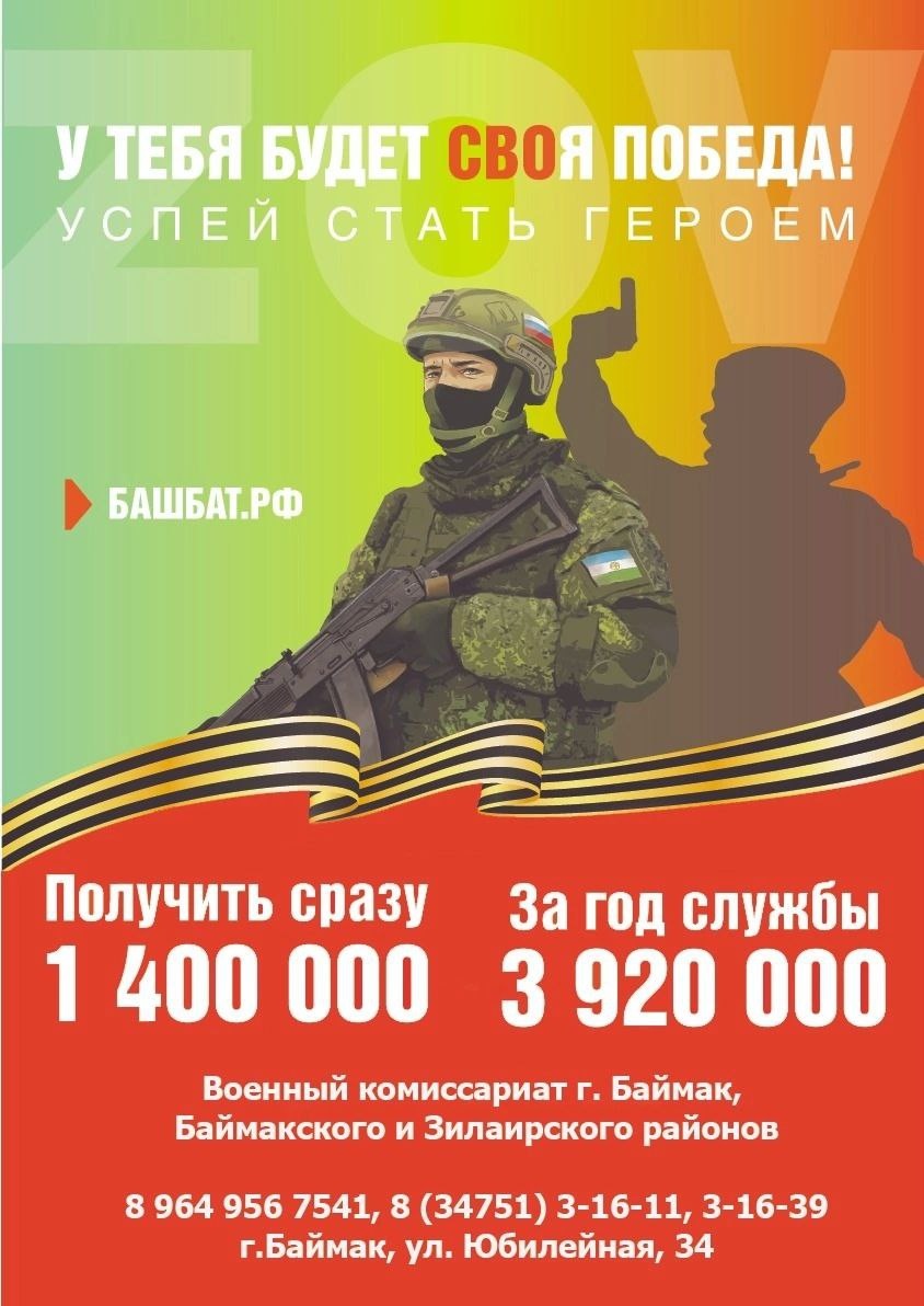 С 5 июня 2025 года единовременная выплата жителям республики, заключившим контракт с Министерством обороны РФ, составит 1,4 млн рублей. Для поступления на службу по контракту необходимо обратиться в военкомат по адресу: г. Баймак, ул. Юбилейная, 34, телефон: 8 (34751) 3-16-11, 3-16-39. Номер инструктора по контракту: +7 964 956-75-41 Служба по контракту в рядах Вооружённых сил России – работа для настоящих мужчин и истинных патриотов!