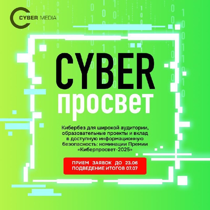 ✅ Продолжается приём заявок на Премию «Киберпросвет» Напоминаем, что заявки принимаются до 23 июня, поэтому стоит поторопиться и запрыгнуть в уходящий киберпоезд. ➡️ Изучите список номинаций, выберите подходящие и направляйте в редакцию Cyber Media заявки на участие. Участие в Премии бесплатное. 😎 Здесь о кибербезе