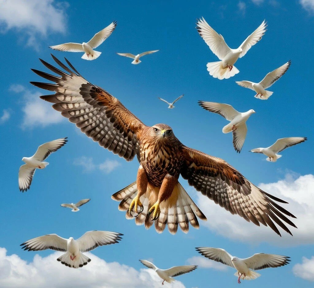 Вовка на автомате развернулся в ту сторону, моментально оценив обстановку. Голуби ещё не успели подняться высоко, метров на тридцать только взлетели, а в их сторону стремительно приближался коршун, уже наметивший себе жертву.