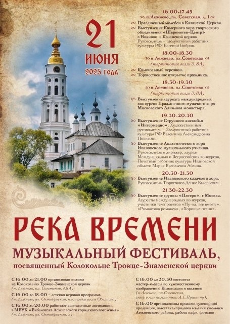 🎶 В Ивановской области пройдет музыкальный фестиваль «Река времени» (0+) 21 июня в Лежневе состоится музыкальный фестиваль «Река времени». Событие посвящено Колокольне Троице-Знаменской церкви. Начнется мероприятие с праздничного молебна в Казанской церкви. Среди гостей события — камерный хор творческого объединения «Шереметев-Центр» города Иваново, лауреаты международных конкурсов Праздничный мужской хор Московского Данилова монастыря, струнный ансамбль «Интермеццо», академический хор Ивановского музыкального училища, ивановский казачий хор, группа «Пятеро» из Москвы. Гости праздника смогут подняться на Колокольню, посетить творческие мастер-классы, а также ярмарку-продажу. Начало в 16:00. 0+