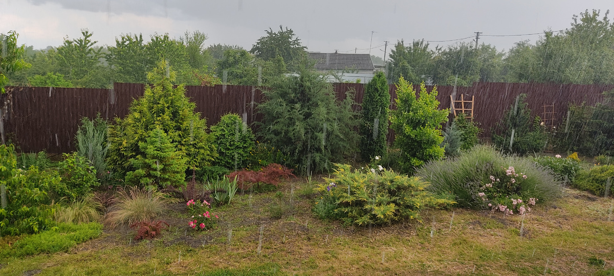 Вчера вечером прошел ливень такой силы и интенсивности, что утром было страшно смотреть по сторонам. Хорошо хоть без града обошлось. Вроде бы невосполнимых потерь не обнаружено. Сегодня дождь с попеременным успехом время от времени загоняет меня в домик, не давая закончить прополку. А полоть сейчас одно удовольствие. Земля влажная и рыхлая, сорняки не оказывают обычного сопротивления и милостиво сдаются на милость победителя. Хорошо, успела перед дождями покосить весь участок, да и зазаборье своё тоже. Хоть какая-то видимость порядка. Куры игнорируют дождь и спокойно разгуливают по травке в поисках чего-нибудь вкусненького. Вчера обнаружила в гнезде шоколадное яйцо, а значит, что стала нестись одна из черных курочек. В холодильнике уже лежит 11 штук, а я всё никак не решусь их продегустировать. Мне их почему-то жалко есть. Розочка Эмбер Квин после проливного дождя выглядит неописуемой красоткой. Жалко, что она пока такая маленькая. Сегодня, используя весь арсенал средств насилия над