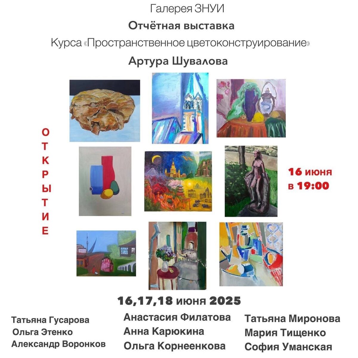 Хочу сегодня заглянуть на Торжественной открытие отчетной выставки курса «Пространственное цветовоконструирование» Артура Шувалова. Девять художников, в том числе и Татьяна Гусарова (наша, Балашихинская)). Торжественное открытие в галерее ЗНУИ в 19:00. Присоединяйтесь :) После можно прогуляться по вечерней Москве.
