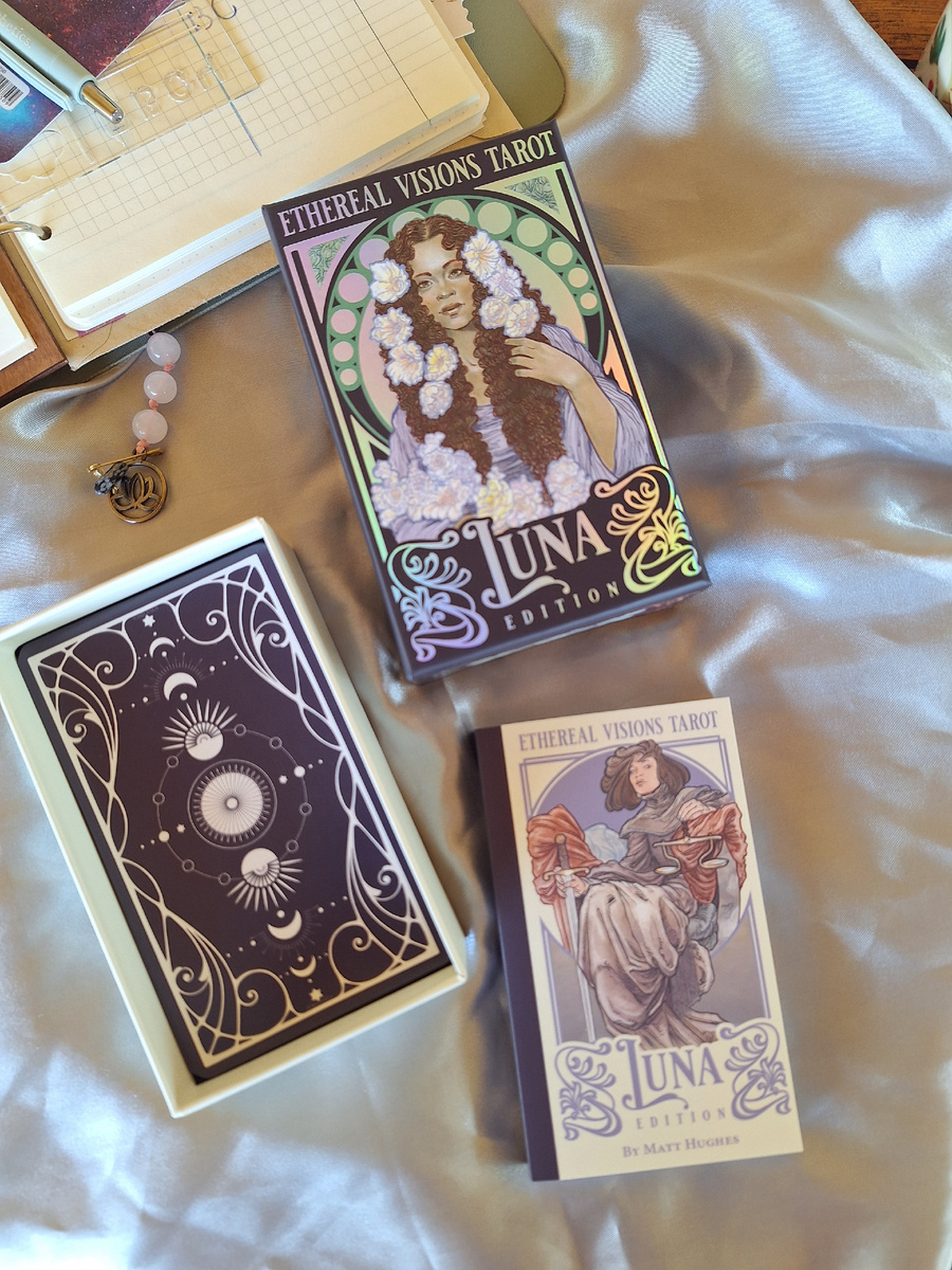 Я давно хотела колоду Эфирных видений, а тут оказывается появилась не золотая , но серебряная ее версия, и она есть на ВБ за ~2400 рублей. "Надо брать," - подумала я и немного пожалела. Коробочка, конечно, симпатичная, с тиснением и серебрением. Это плюс. Однако сам картон кар немного скрипучий на ощупь. Есть глянцевые дешевые карты за 200 р. и они в руках ощущаются гораздо приятней, скользят в руках, их приятно гладить. А тут как будто карты матовые, но их отполировали до гладкости. Сам край карт впрочем выглядит надежно, такой не будет лохматиться. Словом, картон хороший, покрытие не очень. После покупки всегда по одной рассматриваю карты по порядку, и пока смотрела эту колоду, в глазах начало мерцать. Карты настолько блестят этим серебрением с голографическим эффектом, что как будто я смотрела на сварку. Возможно, дело в том, что я сидела спиной к очень ядреным лампам, которые, отражаясь, очень мерцали. Но скорее всего это не так работает. На солнце карты очень яркие и без бликов