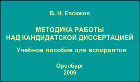 Представляю вам работу "Евсюков В. Н. Методика работы над кандидатской диссертацией: учебное пособие. – Изд. 5-е, допол. – Оренбург: Оренбургский гос. ун-т, 2009. – 539 с.".