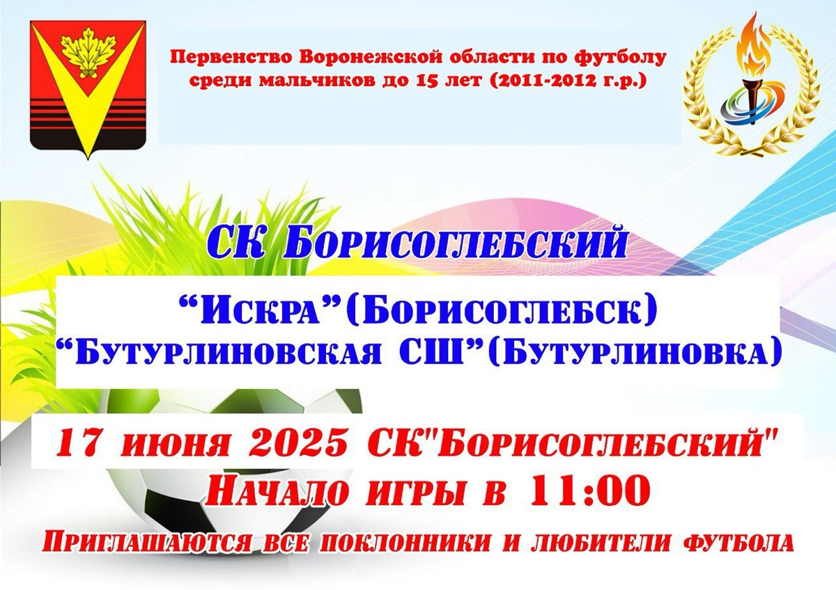 Уже завтра, 17 июня, в 11.00 в СК «Борисоглебский» состоится 2 тур Первенства Воронежской области по футболу среди юношей до 15 лет
