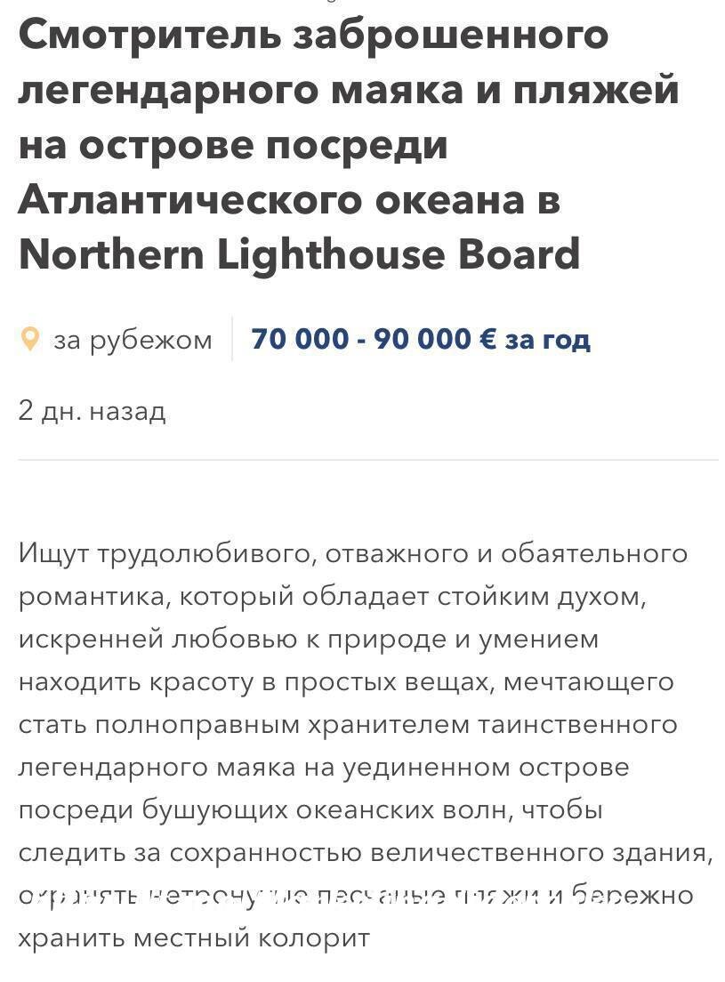 Работа мечты для тех, кто устал от стресса Интроверты, внимание — в Шотландии требуется смотритель заброшенного маяка с зарплатой 8,1 миллиона рублей в год. Придётся жить на острове с населением около 3 тысяч человек. В обязанности входит уход за маяком, протирание линз и периодический ремонт мелких неполадок. В пакет вакансии включены бесплатные завтраки и обеды, скидки на ужины, отдельное жильё и личная моторная лодка для полного уединения от общества. Также обещают полный дзен, местный колорит и отсутствие вечерних дедлайнов в чатах. Судя по количеству заявок, уставшие менеджеры уже собирают чемоданы.