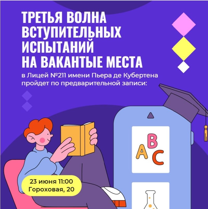 Лицей 211 объявляет о начале записи на 3-ю волну вступительных испытаний в свои профильные инженерные классы на 2025/2026 учебный год. Запись на третью, завершающую, волну тестирования по ссылке с ПК: https://vk.com/app6013442_-198583821?form_id=20#form_id=20 Приглашения в инженерные классы 211 лицея по результатам второй волны вступительных испытаний будут рассылаться с 16.06.25 г.. Подробнее: https://vk.com/wall-198583821_6409