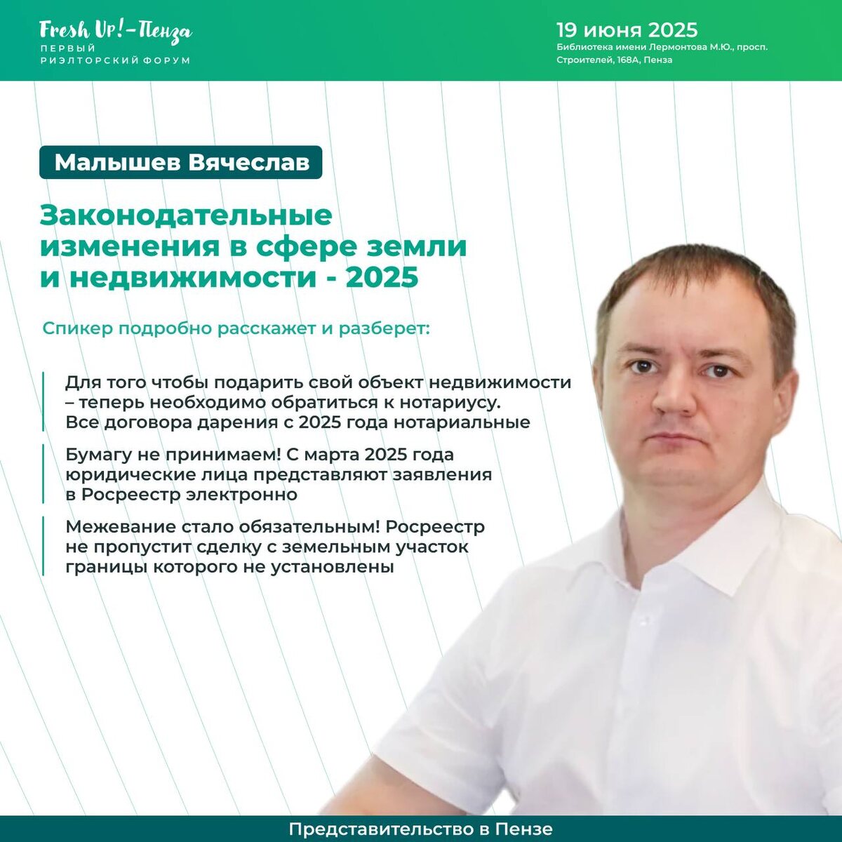 🏡 Земля и недвижимость-2025 — готов ли ты к новым правилам? Ошибки в сделках теперь стоят дороже. А новые требования уже начинают работать. Вячеслав Малышев, начальник отдела регистрации недвижимости №1 Росреестра по Пензенской области, расскажет, что меняется в законодательстве и как избежать проблем с регистрацией. — Дарение только через нотариуса — Электронная подача заявлений для юрлиц — Без межевания — ни шагу — Техплан обязателен для «учтёнки» — Использование объекта — только после регистрации в ЕГРН 📆 19 июня 📍 Библиотека им. Лермонтова, Пенза ⚖️ Работай по закону — приходи и разберись в тонкостях. Регистрируйся!