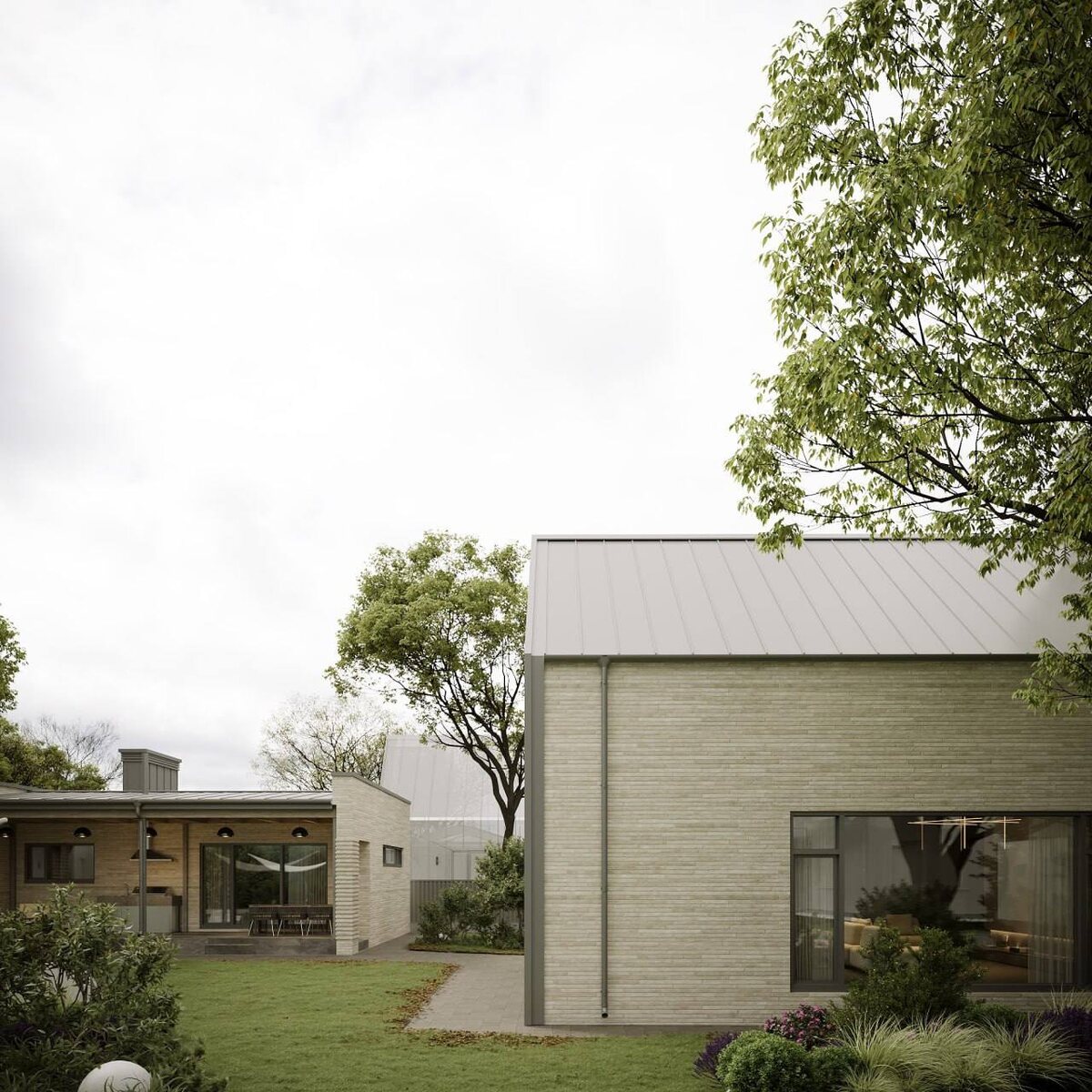 Фасад — барнхаус, но с характером: игра объемов, контраст скатной и плоской кровли, светлые материалы, которые «растягивают» дом по горизонту.