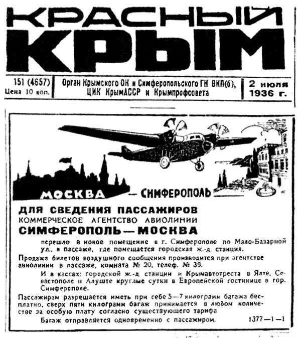 Объявление о переезде агенства авиалиний. Газета "Красный Крым". 2 июля 1936 года. СИМФЕРОПОЛЬ ДЛЯ СВЕДЕНИЯ ПАССАЖИРОВ КОММЕРЧЕСКОЕ АГЕНТСТВО АВИАЛИНИИ СИМФЕРОПОЛЬ- МОСКВА перешло в новое помещение в г. Симферополе по Мало-Базарной ул., в пассаже, где помещается городская ж.-д. станция. Продажа билетов воздушного сообщения производится при агентстве авиолинии в лассаже, комната № 20, телеф. № 39. И в кассах: городской ж.-д станции и Крымавтотреста в Ялте, Севастополе и Алуште круглые сутки в Европейской гостинице в гор. Симферополе. Пассажирам разрешается иметь при себе 5-7 килограмм багажа бесплатно, сверх пяти килограмм багаж принимается в любом количестве за особую плату согласно существующего тарифа Багаж отправляется одновременно с пассажиром. Улица Малобазарная - нынешняя Некрасова. Но выходила она прямо к зданию нынешнего Универмага Центральный, где до Войны был расположен Пассаж - здание Пассажа Анджелло. Именно там располагался, в то время, городской Автовокзал. #Симферопол