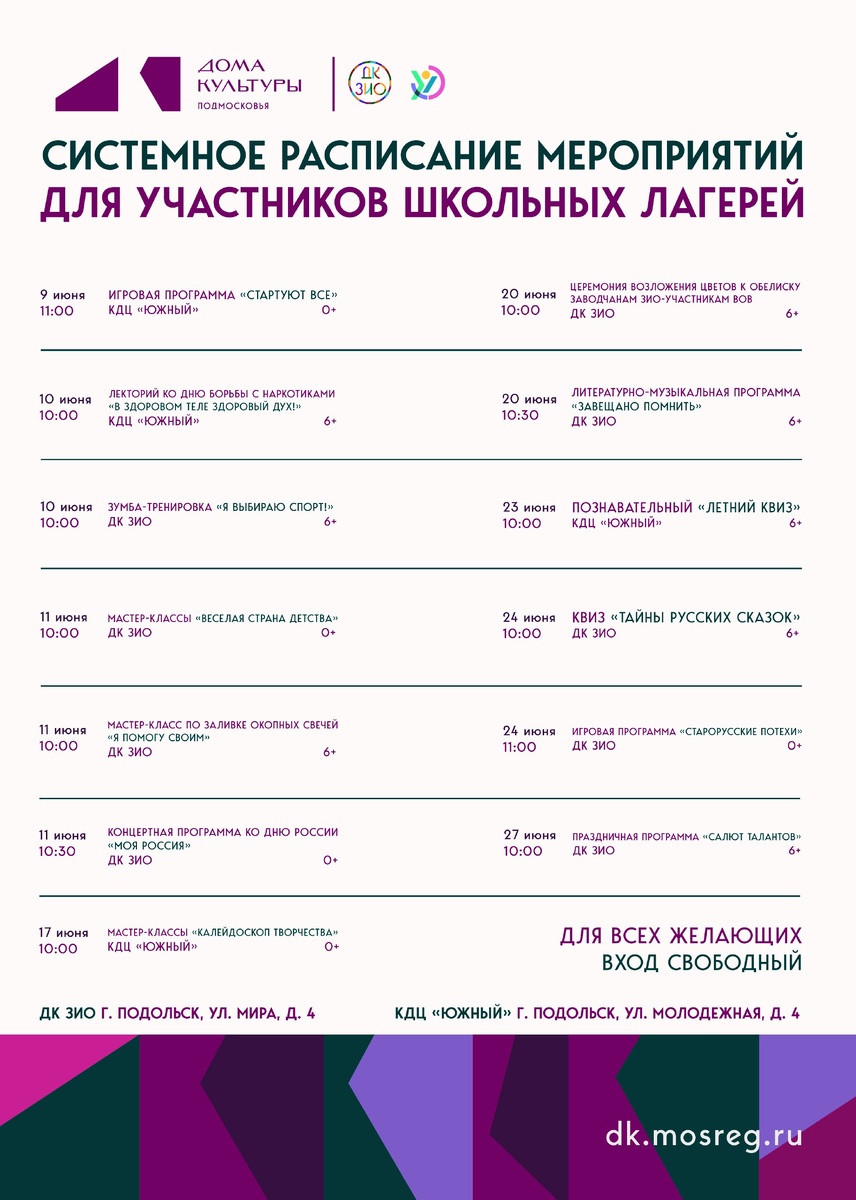 🏀 Летний лагерь для школьников: продолжает работать! С 9 по 27 июня ДК ЗИО и КДЦ «Южный» приглашают детей на бесплатную смену с активностями: — Спортивные турниры и эстафеты; — Патриотические квесты и мастер-классы; — Творческие мастерские. 📅 График занятий: • ДК ЗИО (ул. Мира, 4): 20, 24, 27 июня. • КДЦ «Южный» (ул. Молодежная, 4): 17, 23 июня. ⏰ Точное время и тематику смотрите в афише. Дату и время проведения можно посмотреть на портале: dk.mosreg в разделе события: https://clck.ru/3MXA9k 🎫 Вход: свободный. #Подольск #Мероприятие #КультураПодмосковье #Летний_лагерь