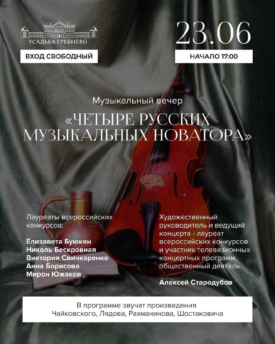 Музыкальный вечер в усадьбе Гребнево всё ближе! Приглашаем вас 23 июня в 17:00 на незабываемый музыкальный вечер «Четыре русских музыкальных новатора» Вход свободный! Это событие — возможность окунуться в атмосферу русской музыкальной традиции, услышать произведения великих композиторов, чье творчество не только оставило след в истории, но и оказало значительное влияние на развитие мировой музыкальной культуры. В программе вечера прозвучат яркие произведения Петра Ильича Чайковского, Анатолия Константиновича Лядова, Сергея Васильевича Рахманинова и Дмитрия Дмитриевича Шостаковича — их всех объединяет глубокая любовь к родной земле, интерес к народным мотивам и стремление передать самые сокровенные чувства человека через музыку. Вы познакомитесь с разнообразием жанров: от проникновенных и нежных мелодий до мощных и драматичных композиций, которые не оставят равнодушными никого. Исполнители — молодые, талантливые музыканты, лауреаты престижных конкурсов по всей России, — с трепетом