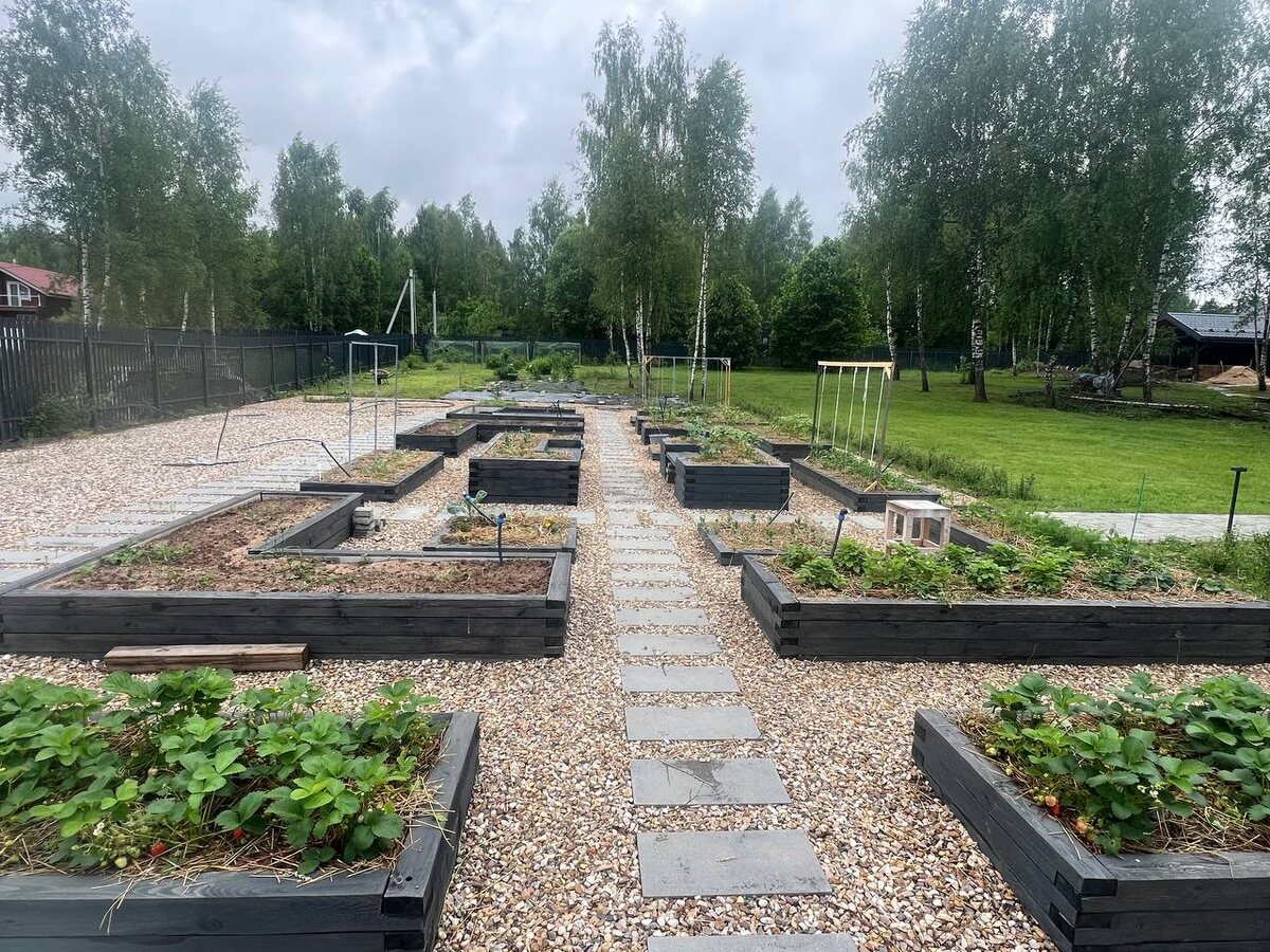 Большой огород по моему проекту в большом саду на нашем объекте «сад у реки» . Сейчас запрос на такие огороды почти в каждом проекте .Разноуровневые грядки из бруса , две центральные грядки со в троенной скамейкой , выводы под свет и капельный полив , гравийное основание и бетонные плиты . Скажу честно — проще и выгоднее было маленький дом построить из бруса 🫣😅 - ну очень много возни , но огород действительно функциональный и красивый как на картинках из пинтерест ♥️ Планируются две стеклянные теплицы и домик для инструментов. Вся зона отделена живой изгородью. У хозяйки уже зреют овощи и ягоды 🍓 Всем отличного начала недели 🌸