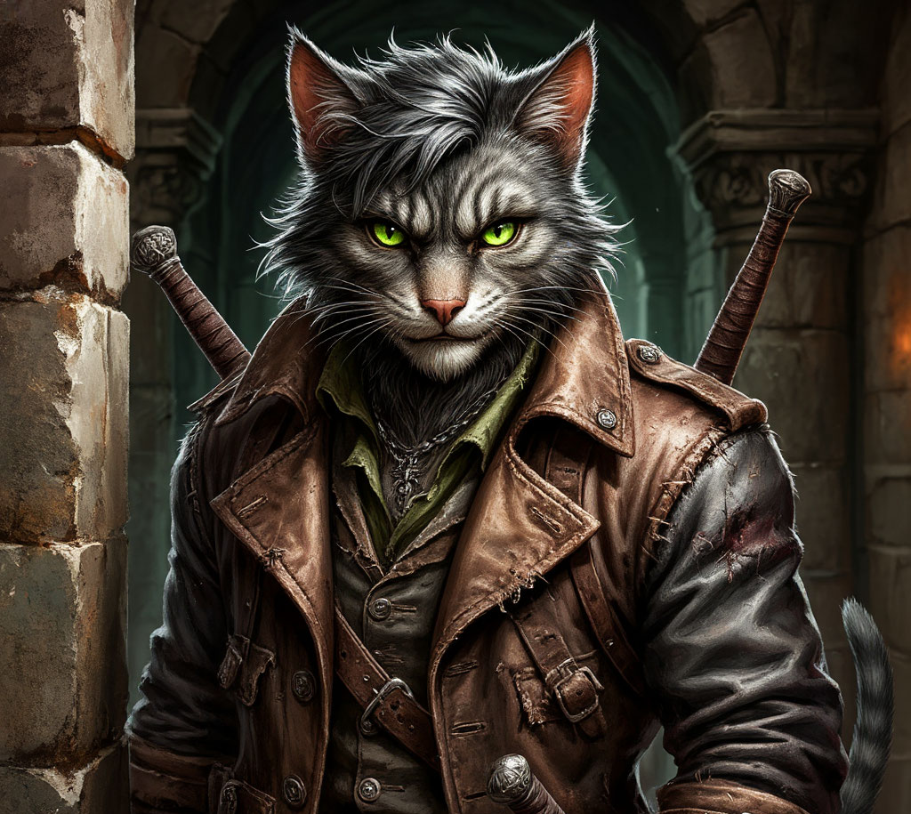 Персонаж для Онлайн приключения "Отряд изгоев" Родился наш герой в каком-то богом забытом табаксийском клане, где все друг у друга таскают еду, а старейшины учат воровать так, чтобы никто не заметил. В детстве Нямта был милым комочком шерсти с глазами как у котёнка из рекламы Whiskas. Но за этой внешностью скрывался характер — такой, что любой прохиндей бы обзавидовался его ехидству. Сначала таскал сало у соседей, потом научился вытаскивать кошельки у зазевавшихся купцов. Всё шло хорошо — до первой серьёзной кражи. В одну дождливую ночь Нямта залез в дом местного ростовщика через форточку (куда ж без этого), но вместо золотишка нашёл там ловушку, да такую, что до сих пор хвост дёргается при воспоминании. Еле ноги унёс — и понял: много форточником не наворуешь, рано или поздно поймают и хвост отрежут. Решил сменить ремесло: стал наёмником. Ну как стал… Просто начал брать деньги за то, чтобы делать гадости другим по заказу. Дуэлянт из него вышел неплохой: быстрый, ловкий, язык острый — в