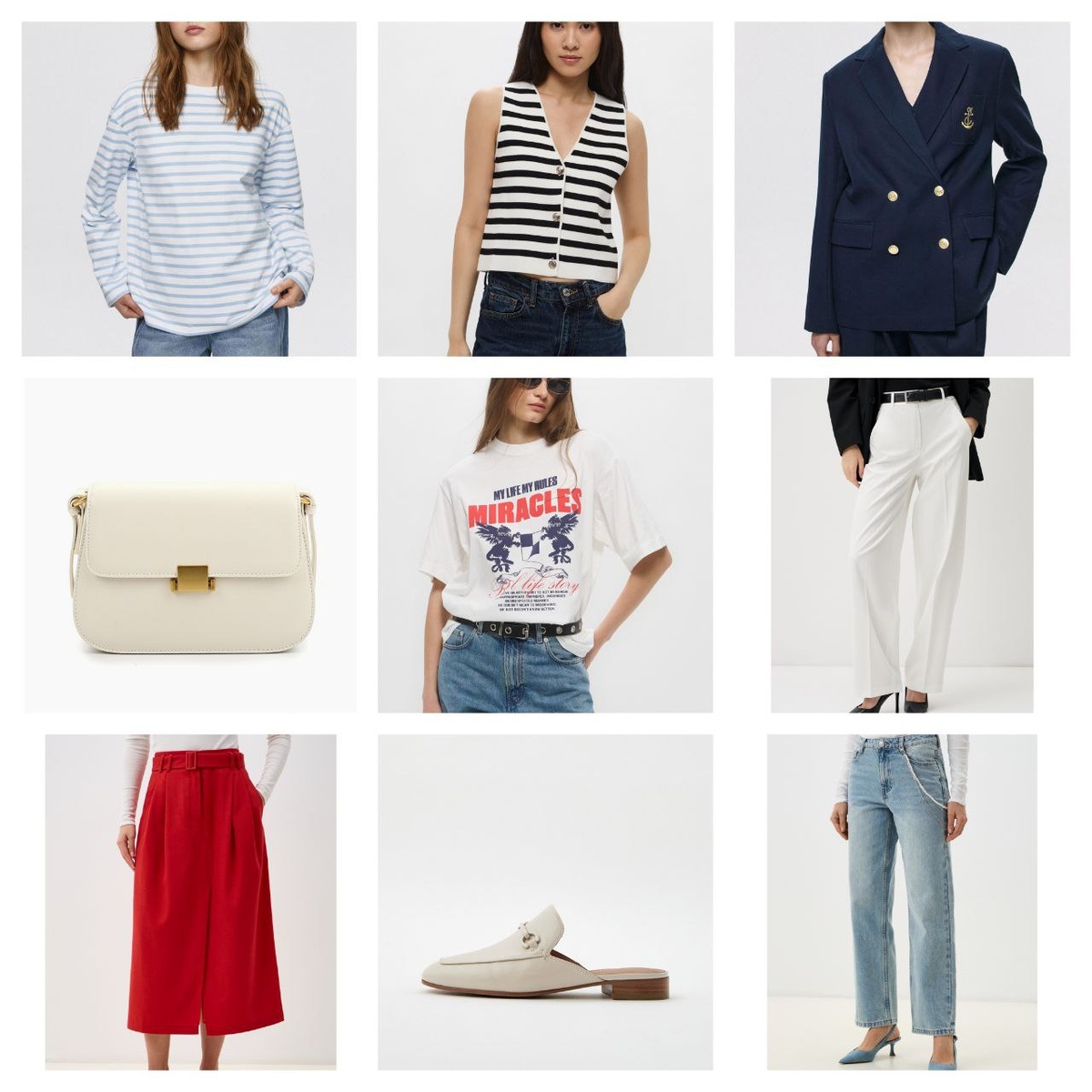 Спортивный стиль и женственный романтизм, морская элегантность и благородный минимализм - выбираем свое направление для создание летних комплектов и учимся комбинировать вещи так, чтобы было не только стильно и модно, но и долговечно. Морской стиль в 2025 году продолжает оставаться популярным, но с новыми акцентами и современными интерпретациями. В этом сезоне дизайнеры предлагают носить матросский воротник, топсайдеры и бескозырки. Классикой остаются бретонская полоска, классический блейзеры насыщенного синего оттенка с золотыми пуговицами или морской принт. Повторяем капсулу: ✔️Футболка за 1400₽ ✔️Лонгслив за 2300₽ ✔️Жилет за 1700₽ ✔️Брюки за 6600₽ ✔️Джинсы за 2400₽ ✔️Жакет за 6700₽ ✔️Юбка за 3900₽ ✔️Мюли за 13000₽ ✔️Сумка за 7400₽ Минимализм остаетсятна пике популярности, предлагая элегантные и лаконичные решения для любого случая. Нейтральные оттенки, легкие ткани, лаконичные силуэты и минимум декора — основа летнего минимализма. Белые, бежевые и пастельные тона создают
