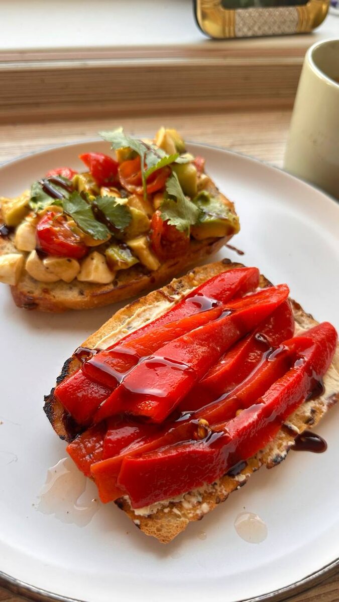 Очень вкусные брускетты с черри,моцарелла, авокадо и вторая с хумусом и печеными перцами Поливаем бальзамическим соусом (не путать с укусусом) Запеченные перцы купила в самокате, прям классные!