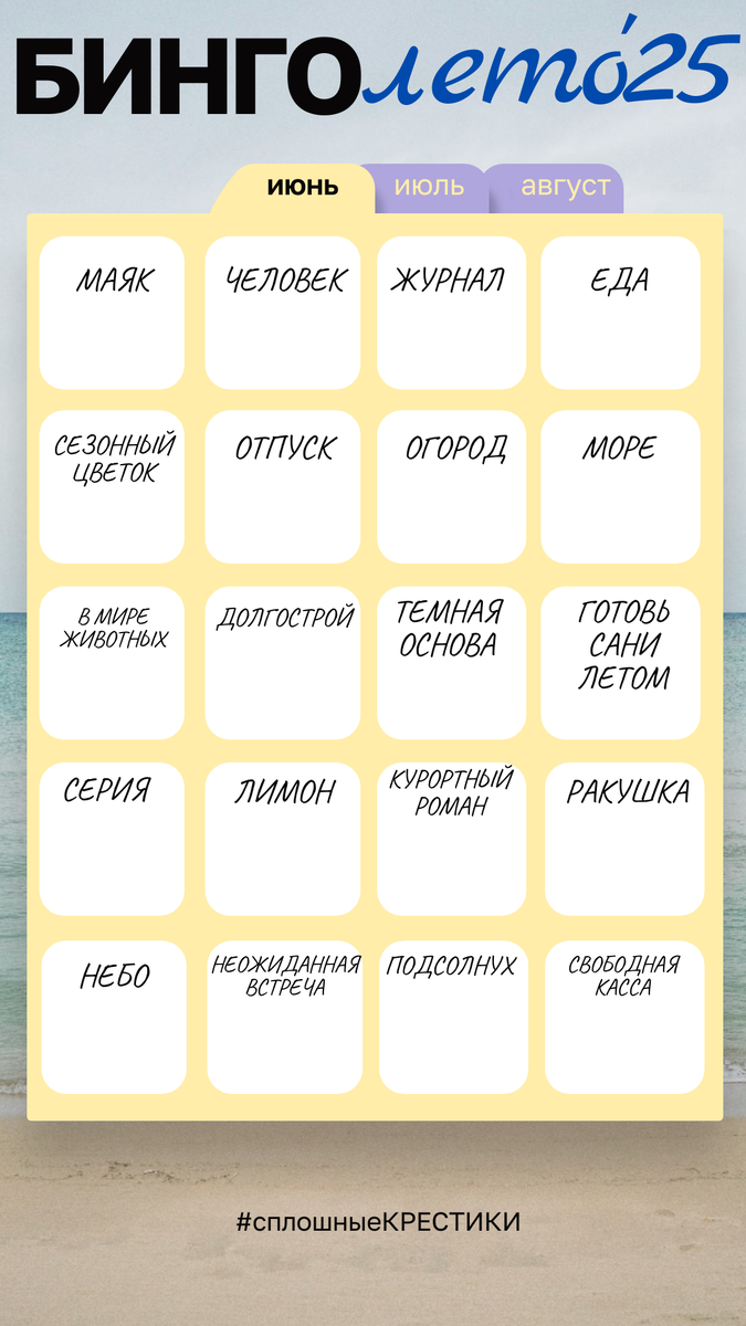 Строго-выстроенные и просчитанные планы это хорошо, но звучит не очень весело. Поэтому я затеяла себе игру - любимое бинго. Перед вами поле с 20 заданиями, которое надо заполнить именно финишами, работа с недошитым сюжетом, хоть и готовым маяком - ячейку не закроет. Должно быть 100%! Середина июня, а у меня закрыты 3 ячейки - надо бы поднажать! Хотите попробовать со мной свои силы?
