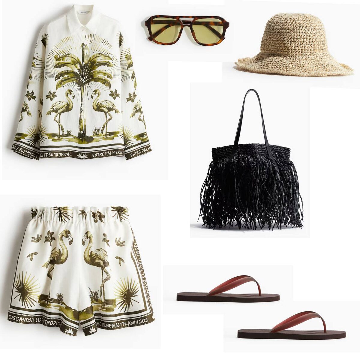 H&M этим летом. Хотя я не фанатка таких принтов, устоять не смогла — всё-таки лето, хочется расслабленности и легкости. Фламинго, пальмы, мягкие ткани, и эти «желейные» шлёпки — как мармелад для ног 🍃🌺 Курортное настроение!🏝️⛱️ Соломенная панама, сумка с бахромой — и сразу некуда спешить.