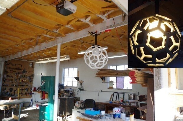 Конечно, можно зайти на сайт интернет-магазина, выбрать прожекторы или промышленные светильники, но не торопитесь, сделать это вы всегда успеете. Сначала посмотрите подборку самодельных светильников для мастерской, возможно, среди них есть то, что вам нужно. 20-сторонний многогранник с пятиугольными гранями называется усеченным икосаэдром. Однако, если вы не в курсе этих геометрических тонкостей, все равно оцените идею и исполнение. Превосходно собранный, с точно подогнанными углами, этот замысловатый светильник в форме многогранника, способен украсить любое помещение, но мастер решил подвесить его к двутавровой балке над рабочим верстаком. Реализовать такой проект без специального углозарезного станка крайне проблематично. Мастер, собравший светильник, приобрел подержанный станок и, чтобы отточить навыки работы с нестандартными углами, решил создать о