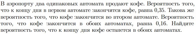 Здравствуйте, уважаемые читатели! Читая и слушая отзывы школьников о ЕГЭ по математике профильного уровня, которое прошло 27 мая, стало ясно, что в среднем варианты первой части оцениваются как вполне легкие. Но была все же задача, которая пришлась не по нраву многим ребятам - задача про кофейные автоматы. Вот и она. В этой задаче по вероятности (как и в большинстве других) необходимо проанализировать события: какие вообще события есть в задаче и какими они являются друг по отношению к другу. Для начала перечислим события, которые присутствуют в условии задачи. Введем обозначения событий "А" и "В". Отлично. Как обозначить событие "кофе закончится в обоих автоматах"? Для этого можно воспользоваться наглядным инструментом - диаграммой Эйлера-Венна. У событий "А" и "В" есть кое-что общее: закончился кофе. Поэтому круги событий пересекаются. Пересечение может быть обозначено знаком "подкова вниз" или знаком "умножение". Таким образом, Теперь осталось понять, что необходимо найти. Заметим,