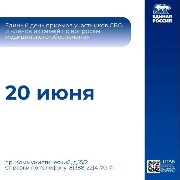 🗓 20 июня 2025 года в Региональной общественной приёмной Председателя Партии "Единая Россия" Д.А. Медведева в РА пройдёт Единый день приёмов участников СВО и членов их семей по вопросам медицинского обеспечения ☎ Предварительная запись по телефонам 8-923-667-2854 и 8(388-22) 4-70-71 с 9.00 до 17.00ч. 📍Адрес: г. Горно-Алтайск, пр. Коммунистический, д.15/2 #ЕдинаяРоссия04 #РеспубликаАлтай #ОбщественнаяПриемная #ЕРПомогает #СВО
