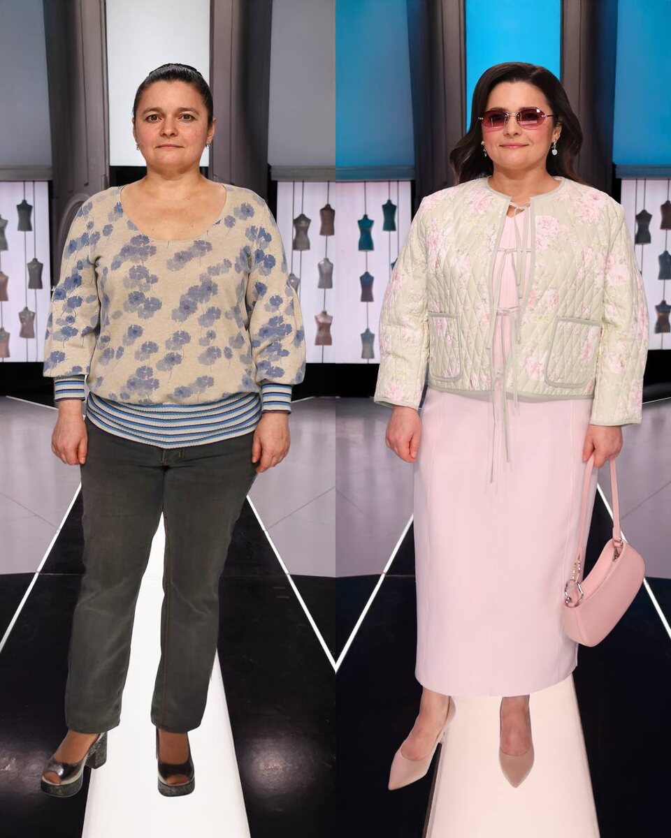 Судя по вашим откликам, рубрика разборов из «Модного приговора» вам очень понравилась, и мы продолжаем! Хочу подчеркнуть, что моя цель — не расстроить или обесценить работу стилистов, а помочь вам научиться анализировать ошибки на живых примерах, чтобы избежать их в выборе образов для себя, особенно если вы похожи по фигуре или типажу. Сегодня у нас на разборе яркая брюнетка. Первый образ выглядит удачно благодаря форме платья, но верхняя накидка (жакет) напоминает сидушку на стул, особенно на фоне яркой внешности героини… Цветочки, особенно в таком бледном тоне, не подчеркивают ее красоту. Этот элемент гардероба совершенно лишний. Даже одно платье смотрелось бы лучше. Ну, а если уж надевать что-то сверху, то, рассматривая более дневной вариант, можно накинуть джинсовую куртку или бомбер, а для вечернего — контрастный или яркий жакет. Что касается черного образа, он более удачный, хотя и здесь есть нюансы. Черный цвет не совсем соответствует её характеру, но это допустимо в разные пери