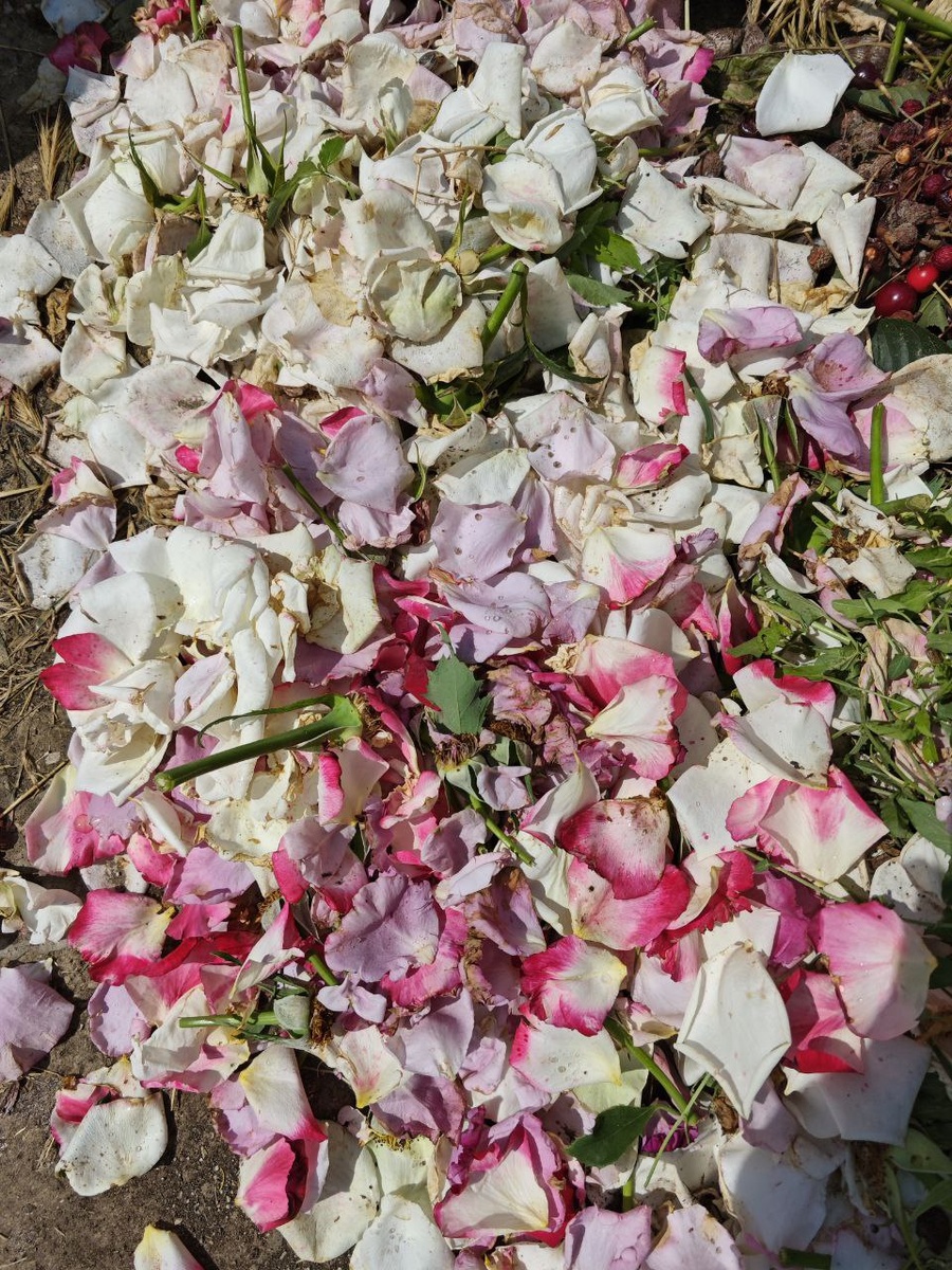 Обломала завядшие головки роз, подобрала с земли опавшие лепестки, иначе вид не эстетичный. Обламывать головки надо чтобы не завязывались плоды и, к тому же, это стимулирует к дальнейшему цветению. Вот сколько цветов убрала.