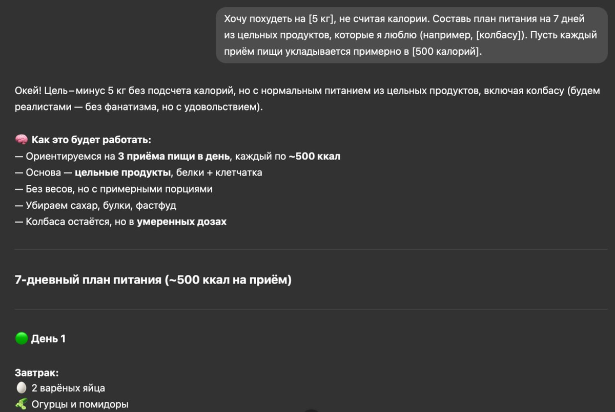 Превращаем ChatGPT в личного диетолога и худеем БЕЗ СПОРТЗАЛА — нашел 7 промтов, которые помогут тебе сбросить лишние килограммы: Хочу похудеть на [количество кг], не считая калории. Составь план питания на 7 дней из цельных продуктов, которые я люблю (например, [вставьте продукты]). Пусть каждый приём пищи укладывается примерно в [вставьте диапазон калорий]. Вечером меня всегда тянет есть. Подскажи 3 сытных и малокалорийных блюда, которые помогут не сорваться и не думать о еде. Я не занимаюсь спортом. Подскажи 5 простых ежедневных привычек, которые реально помогают сжигать жир без зала. Какие продукты стоит заменить, чтобы меньше вздувало живот и снизилось воспаление? Предложи полезные альтернативы вместо стандартных переработанных продуктов. Обычно тянет на сладкое в районе [вставьте время]. Подскажи перекусы с низким сахаром и высоким содержанием белка, чтобы насытиться и продолжать худеть. По выходным я часто ем в кафе или ресторанах. Составь простой план, как не срываться и при эт