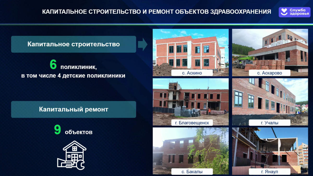 В этом году в рамках программы «Модернизация первичного звена здравоохранения Республики Башкортостан» будет освоено 5 миллиардов рублей, в том числе 3,5 миллиарда из федерального бюджета. Министр здравоохранения РБ Айрат Рахматуллин выступил на оперативном совещании в правительстве, доложив о модернизации объектов здравоохранения. Так, он рассказал, что в этом году в республике планируется открыть шесть новых поликлиник. Строительные работы уже ведутся в Аскинском, Бакалинском, Абзелиловском районах, а также в Благовещенске, Учалах и Янауле. Помимо этого, в регионе запланирован капитальный ремонт девяти медицинских учреждений и установка 134 модульных конструкций. На данный момент смонтировано уже 63 быстровозводимых модуля. Планируется закупить почти пять тысяч единиц медицинского оборудования. На сегодняшний день в больницы и поликлиники республики поступило 3838 единиц. В эксплуатацию введено девять единиц тяжелого оборудования, включая три маммографа и шесть стационарных рентген-а