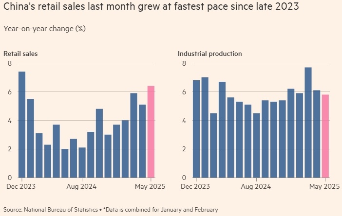 Рост потребительских расходов — «светлое пятно» для экономики, столкнувшейся с повышением тарифов в США Согласно официальной статистике, в мае промышленное производство в Китае выросло не так сильно, как в предыдущие месяцы. Однако потребительские расходы увеличились, что может свидетельствовать о неопределённости в экономике второй по величине экономики мира в условиях торговой войны с США. В прошлом месяце промышленное производство выросло на 5,8% по сравнению с аналогичным периодом прошлого года, сообщило Национальное статистическое бюро в понедельник. Это самый низкий показатель в этом году после роста на 6,1% в апреле. Розничные продажи выросли на 6,4%, что превзошло прогнозы аналитиков и стало самым высоким показателем с декабря 2023 года. Китай уже давно пытается стимулировать потребительский спрос, что является главным приоритетом для правительства президента Си Цзиньпина. Экономика страны борется с дефляцией и замедлением роста в секторе недвижимости, который продолжается уже