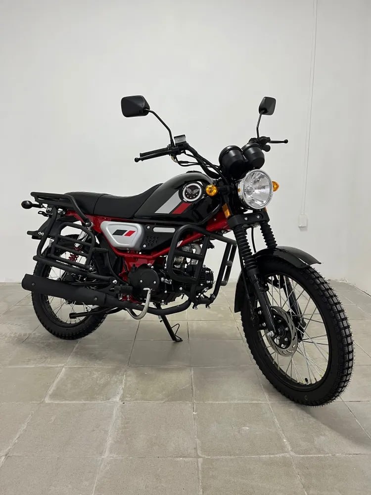 Мопед COLT BLACK: стильный городской транспорт для активных горожан Общая характеристика модели: COLT BLACK представляет собой современный мопед, сочетающий в себе стильный дизайн, надежность и практичность. Модель разработана специально для смешанной эксплуатации и идеально подходит как для ежедневных поездок, так и для коротких путешествий. Дизайн и внешний вид: Экстерьер мопеда выполнен в агрессивном спортивном стиле. Черный глянцевый цвет кузова создает эффектный внешний вид, который дополняется красной стальной рамой. Эргономичное сиденье с противоскользящим покрытием обеспечивает комфорт как водителю, так и пассажиру. Технические характеристики — Объем двигателя: 110 куб.см — Тип двигателя: 4-тактный с воздушным охлаждением — Мощность: 7 л.с. при 7500 об/мин — Максимальная скорость: 95 км/ч — Расход топлива: 2.5 л на 100 км — Объем топливного бака: 10 л — Вес: 105 кг — Колесная база: 1230 мм — Клиренс: 165 мм Особенности конструкции: — Рама мопеда выполнена из высокопрочной
