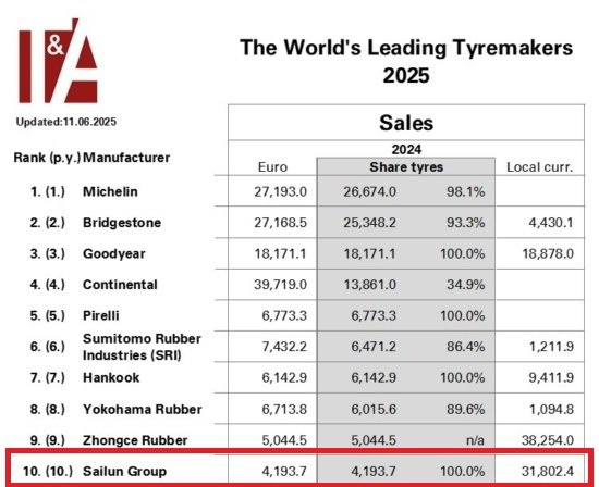 🔼Топ-10 мировых производителей шин по итогам 2024 года. Tyres & Accessories опубликовало свежий рейтинг шинных компаний мира. Расстановка за год не изменилась, Sailun укрепляет свои позиции, сохраняя самые высокие темпы роста в первой десятке. #Sailun #рейтинг