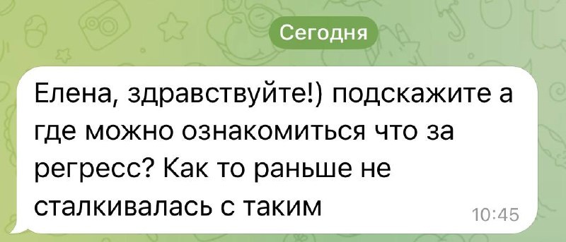 Что такое регресс и для чего он нужен. Регрессивная терапия — это метод психологической работы, который помогает исследовать глубинные причины текущих проблем через погружение в прошлый опыт (включая детство, внутриутробный период или даже гипотетические прошлые жизни). Цель — осознать и трансформировать травмы, страхи или блоки, мешающие жить полноценно сейчас. Особенности сеанса у меня: 🔹 Стоимость: 10 000₽ за сессию (длительность 2–2.5 часа). 🔹 Эффективность: За одну встречу можно проработать до 5 разных запросов! Например: • Страхи + отношения + неуверенность • Блоки в финансах + здоровье + предназначение • Проблемы с родителями + повторяющиеся сценарии + поиск ресурса • Общение с ушедшими близкими: На сессии вы можете встретиться с душами умерших родственников или важных для вас людей (родителей, партнеров, детей, друзей). Это позволяет: • Получить ответы на волнующие вопросы, • Попросить прощения или завершить недоговорённое, • Обрести поддержку, почувствовать связь и покой.