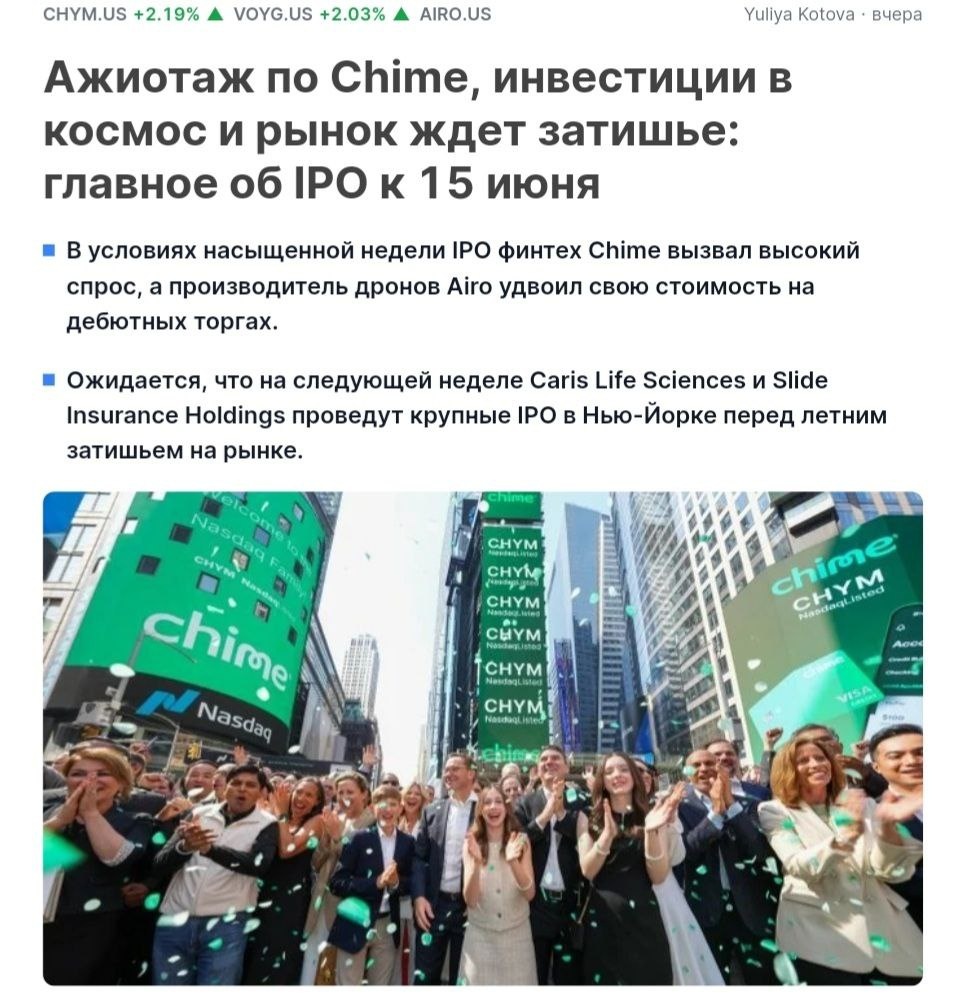 🔥Неделя для рынка IPO выдалась насыщенной: размещение финтех-стартапа Chime вызвало ажиотажный спрос инвесторов, а небольшой производитель дронов #Airo подорожал более чем вдвое на дебютных торгах. Еще два крупных размещения ожидаются в Нью-Йорке в ближайшие дни перед летним затишьем. Что нового произошло на рынке IPO — в нашей подборке. Будущие размещения — Два крупных IPO запланированы на следующую неделю перед ожидаемым летним затишьем на американском рынке, пишет Bloomberg. Медтех-компания Caris Life Sciences, использующая искусственный интеллект для диагностики и лечения рака, надеется привлечь $423,5 млн с оценкой в $5,35 млрд. Страховая компания Slide Insurance Holdings, специализирующаяся на страховании жилья во Флориде и Южной Каролине, планирует продать акции на $340 млн исходя из оценки всей компании более чем в $2 млрд. — Компания Jefferson Capital, которая занимается покупкой и управлением просроченной и списанной задолженностью, планирует в ходе IPO привлечь до $170 мл
