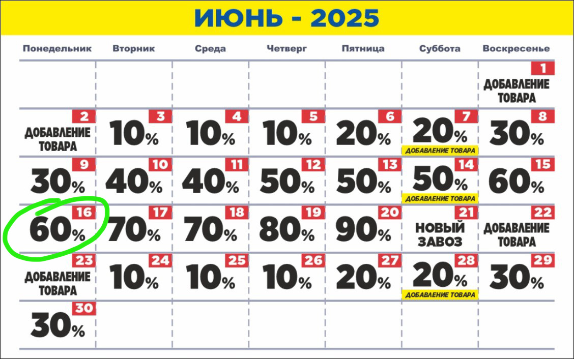 Приветствую Вас, мои дорогие подписчики. А если Вы таковыми ещё не являетесь, то скорее подписывайтесь на мой канал в Дзен и телеграм👇, чтобы всегда быть в курсе появления новых интересных вещей и успеть их приобрести для себя или своих близких. Сегодня у меня первый день долгожданного отпуска, а в Мегахенде г. Челябинска по ул. Труда,183 скидка 60%. Надо съездить, разузнать обстановку. А это 👇 календарь скидок на июнь в Мегахенде по данному адресу. В нашем городе есть ещё один магазин Мегахенд, но там совершенно другой календарь скидок. Видимо, у каждого отдельно взятого Мегахенда свои графики. Итак, я приехала... Территория магазина огромная, даже при большом желании невозможно за одно посещение просмотреть все имеющиеся вещи. Но сотрудники магазина работают на славу. Могу перечислить плюсы Мегахенда: 1. Все вещи развешаны по категориям: платья, брюки, блузки и т.д. 2. Есть разделение на мужской и женский ассортимент, в отличие от Зигзага Удачи. 3. Вещи на рейлах расположены п