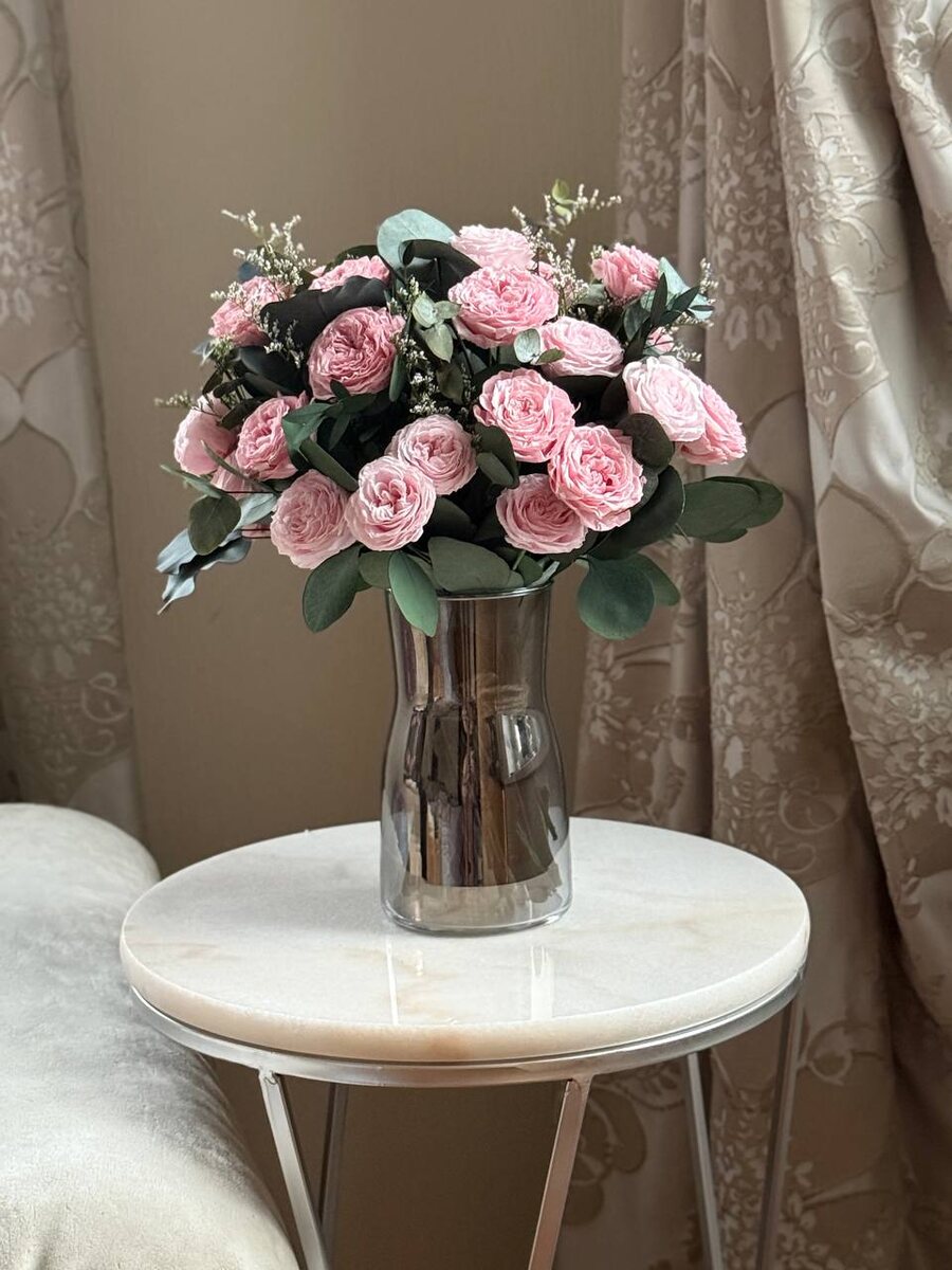 ⚜️нет в наличии. ⚜️Букет из кустовых роз «Lady» ⚜️Состав: стабилизированные розы, стабилизированная зелень эвкалипта, ваза стекло. ⚜️Цена: 20000₽ (ваза входит в стоимость) ⚜️Размер с учётом вазы: высота 31 см, диаметр 24 см. ⚜️Заказы принимаем на WhatsApp https://wa.me/79261344455 или по телефону 89264344455