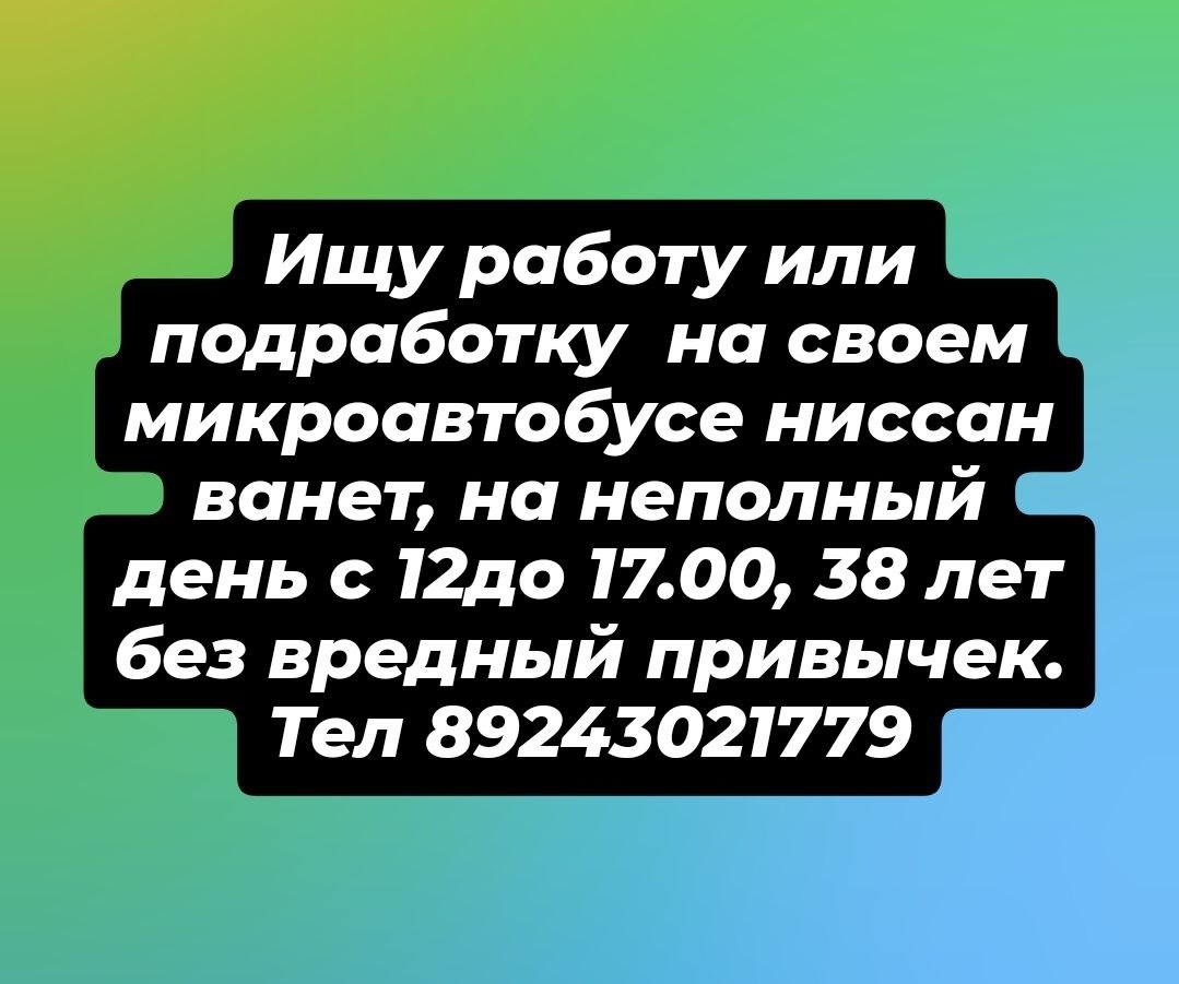 Ищу работу или подработку на своем микроавтобусе ниссан ванет, на неполный день с 12до 17.00, 38 лет без вредный привычек. Тел 89243021779