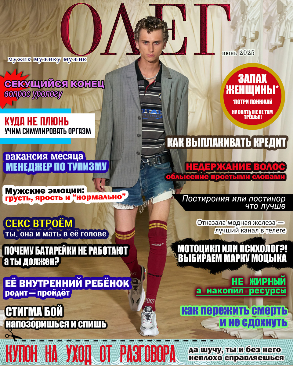 Салют, немодные! Очередная порция новинок испеклась в головах дизйнеров и я несу в клювике вам. Но начнем со свежайшей прессы. Новый выпуск мужского журнала "Олег" уже во всех умозрительных киосках мира. Уф! Кажется, сегодня тему трусов полностью раскрыли! с любовью Алла Корж Кому удобнее читать канал в телеге - вэлком! https://t.me/Modnayazheleza