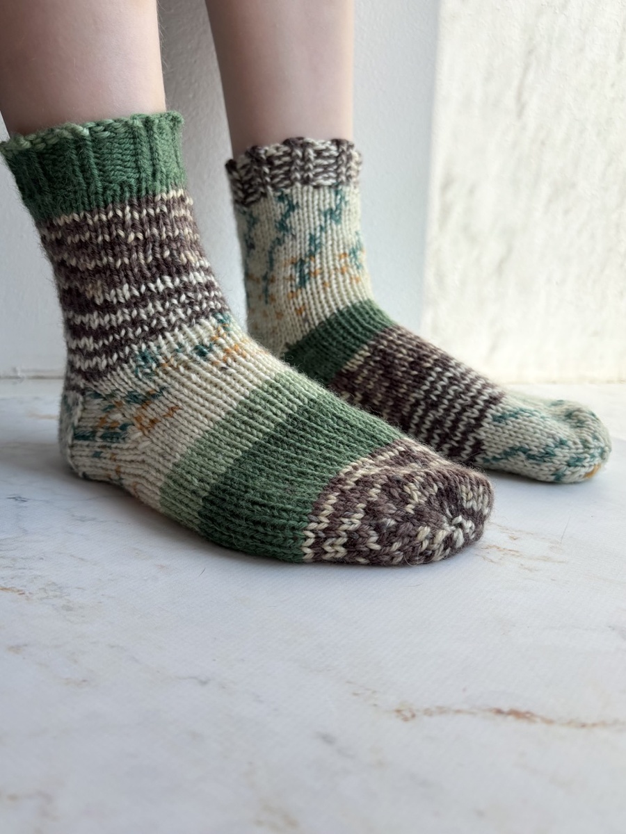 Мне очень хотелось попробовать связать из секционки Wooltime, а моему Матвею нужны были новые носки. Всё сошлось :)) Wooltime - это 8-ми ниточная носочная пряжа, то есть её метраж 200 метров на 100 грамм. Производитель рекомендует спицы 4-5, значит для носков берём поменьше - четвёрку. Я уже вязала из толстой пряжи носки и прикинула, что на Матвеин 32-ой размер ноги нужно набрать 36 петель. К нужному количеству не забываем добавить + 1 петлю - для замыкания вязания в круг. Замкнули вязание в круг и вяжем резинку. Высокие резинки не люблю, обычно вяжу 10 рядов. Тут у меня резинка 2х2, где две лицевые петли чередуются с двумя изнаночными. Лицевые петли вяжем перекрещенными - за заднюю стенку, что при вязании по кругу очень удобно. После резинки переходим на гладь и вяжем 25 рядов до пятки. Как красиво получается, любуюсь! Стенка пятки укрепленная, 20 рядов. Низ пятки - подкова. Когда пятка готова, поднимаем петли по бокам стенок пятки и продолжаем вязать основную длину до мыска. Не з