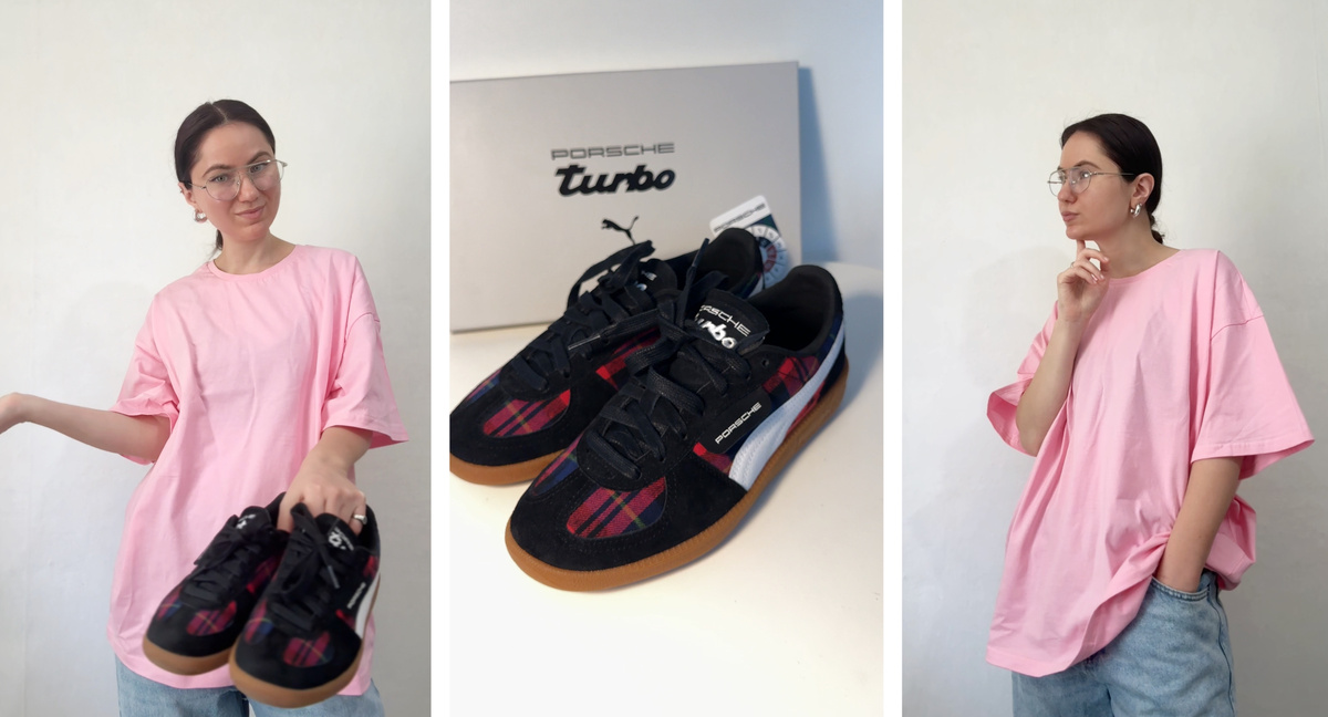 Когда в очередной раз я стояла перед шкафом, раздумывая, что надеть, мой взгляд остановился на любимой паре кроссовок Puma из коллаборации с Porsche. С чем же их идеально сочетать? Я начала перебирать вещи на полках в поисках идеального образа. Всё выглядело слишком просто, а мне хотелось подчеркнуть уникальность этой коллаборации. Внезапно меня осенило: почему бы не создать что-то уникальное, что идеально дополнит мои любимые кроссовки и раскроет смысл этой модели? Они посвящены редкому Porsche 911 Turbo 1974 года. Кроссовки выполнены из замши и текстиля в клетку-тартан, но, помимо логотипа и надписей, к легендарному автомобилю нет никаких отсылок... Значит, нужно раскрыть идею этой коллаборации через другой элемент гардероба – футболку с принтом! Я обожаю принты и профессионально занимаюсь иллюстрацией и дизайном. За это время я создала множество различных принтов и активно веду телеграм-канал на эту тему. Обязательно подписывайтесь, если Вам интересны подобные истории о создании ди