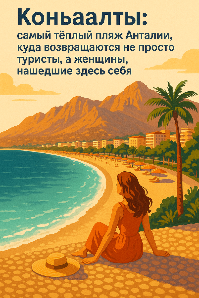 Вы хотите не просто отель, а место с душой. Где комфорт и природа, красота и безопасность. Где можно остаться одной – и ни на секунду не почувствовать себя одинокой. Именно поэтому женщины со всей Европы и России выбирают Коньяалты – не просто курорт, а уголок нового женского баланса. Здесь всё — про вас. 13 километров чистейшего берега, аккуратно выстеленного мелкой галькой, что делает воду невероятно прозрачной. Утром море стеклянное, после обеда играет волнами. А вечерами — светится золотом заката, будто поздравляет вас с правильным выбором. Этот пляж удостоен Голубого флага, а значит — тут не только красиво, но и экологично. Лайфхак: Галечный берег = никаких песчинок в волосах, одежде или телефоне. Идеально, не так ли? С одной стороны —