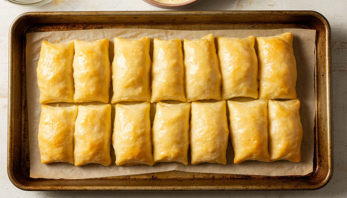 Смазывай противень маслом или защищай пергаментом, выкладывай штрули швом вниз. Достань волшебную смазку - взбитое яйцо! Смажь каждый рулетик - ради хрустящей золотой корочки, чтобы за столом все ахнули. Духовка ревёт от нетерпения? Разогрей до 180°C и ставь штрули на 20-25 минут. О, как дом наполняется ароматом, как сердце замирает в ожидании! Лови момент: если хочешь - смажь штрули сливочным маслом для мягкости и пышности.