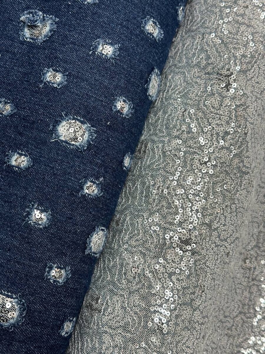 NEW Костюмный двухслойный синий деним с перфорацией и нижним слоем из сетки с пайетками. Артикул: 15.05.25.120 Состав: первый слой 100% хлопок + второй слой 80% Пэ, 20% акрил Ширина: 157 см Вес: гр.м.кв 373/ гр.м.п. 598 Стоимость: 3590₽ п.м. Проконсультироваться и сделать заказ @O_Fabric WhatsApp +79668611153