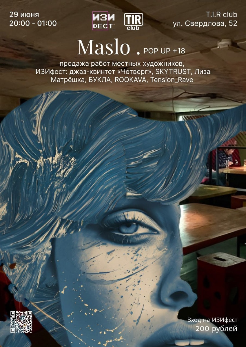 С 20:00 до 01:00 в зале POP UP Maslo. Это искусство, которое можно осязать. Местные художники представят свои работы, которые можно приобрести и забрать домой. Пусть последний день ТИРа останется с вами навсегда.